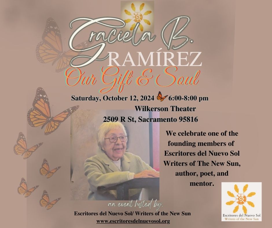 Join us in celebrating author, poet, mentor, educator, and one of the founding members of Escritores del Nuevo Sol / Writers of the New Sun. Mark your calendars! Please invite others! Thank you!